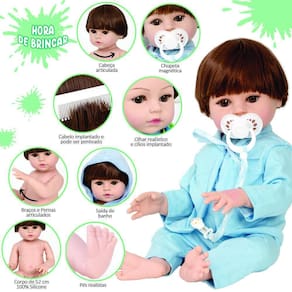 O Boneco Bebê Reborn é o sonho da criançada Produzido 100% em vinil siliconado, esse boneco pode sentar, deitar e fazer tudo que a sua imaginação deixar. Com seus olhos castanhos e detalhes realistas ele é encantador e apaixonante. Sua criança merece a melhor qualidade de bebê reborn