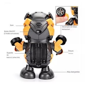 Boneco Bumblebee Robô Dançante Musical Boneco Dance Hero Robô Dançante Características: - Emite sons de música - Possui Led nos olhos e cabeça - Pés que balançam - Acessórios removíveis - Necessário usar 3 pilhas AA Não inclusas no robô -sugestão de uso acima de 3 anos - Pesa 276 gramas Conteúdo da embalagem: 1 Robô dançante 2 Acessórios de rodas removíveis : 90 dias contra defeitos de fabricação Marca: Não Informado