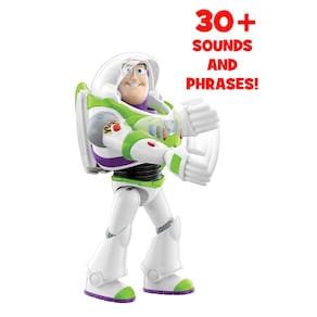 - Pressione o grande botão vermelho no peito da figura para ouvir mais de 30 frases tiradas dos filmes Toy Story! Bom trabalho, Space Ranger!