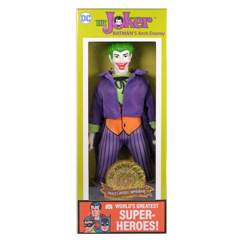Mego DC Joker 50th Anniversary Boneco de 20 cm - Comemore 50 anos de diversão com bonecos - Boneco estilo retrô de 20 cm - 26 pontos de articulação - Fantasias e acessórios que reproduzem de perto as figuras autênticos - Caixa de estilo clássico para colecionadores