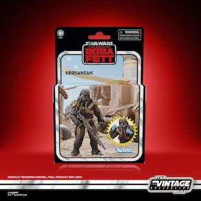 EMBALAGEM ESPECIAL: Este boneco de ação de luxo Krrsantan em escala de 3,75 polegadas de Star Wars The Vintage Collection apresenta ilustrações de embalagens especiais, bem como a marca Kenner