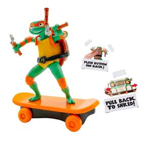 Teenage Mutant Ninja Turtles 5" Sewer Shredders Movie Edition Michelangelo Ages 3+ Shredding Action Figure — Destrua e lute com este brinquedo de skate TMNT de 5” inspirado em filmes. - Projetado com o Teenage Mutant Ninja Turtle Michelangelo e seus icônicos nunchuks - Puxe o brinquedo para trás e veja Michelangelo cavalgar. Inicie o modo de batalha pressionando a meia concha da Tartaruga. - Disponível com Leonardo, Michelangelo, Donatello e Raphael. Colecione todos eles. - Adequado para maiores de 3 anos