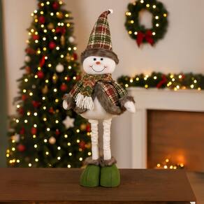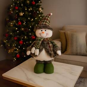 Encante sua decoração natalina com o Boneco de Neve em pelúcia branca com roupa verde xadrez, modelo premium com pernas retráteis extensíveis, que variam de 55cm a 75cm de altura. Um enfeite sofisticado e versátil, ideal para se adaptar a diferentes espaços da sua decoração.