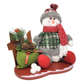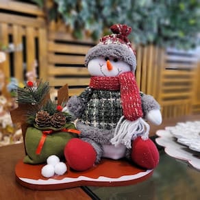 -01 Unidade Boneco de Neve Pelúcia Natal na Cerca Base Madeira 23cm Saco de Presentes decorado Pinhas e Pick