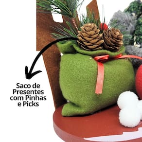 Adicione um toque de charme rústico à sua decoração natalina com este Boneco de Neve decorativo. Com 34 cm de altura, ele está elegantemente vestido em pelúcia vinho com detalhes xadrez e cinza, em um estilo acolhedor e tradicional. Posicionado sobre uma base de madeira, este Bone de Neve vem acompanhado de um saco de presentes adornado com pinhas naturais e picks festivos. Perfeito para mesas, prateleiras ou para criar um cenário natalino encantador em qualquer ambiente.