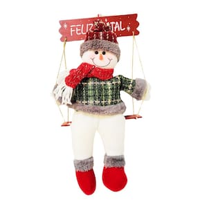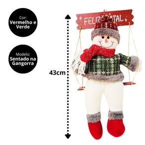 -01 Unidade Boneco de Neve Decorativo Sentado na Gangorra – Pelúcia Rústica, Vinho com Cinza e Verde, 43cm