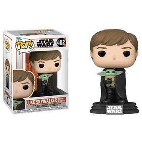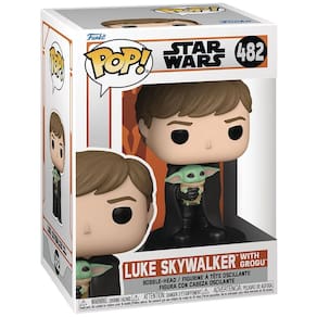 - De Star Wars: The Mandalorian, Luke Skywalker com Grogu, como um vinil POP estilizado da Funko!