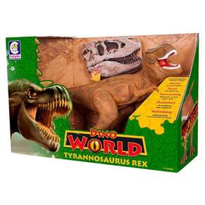 Dino World Tyrannosaurus Rex da Cotiplás ref 2088 O dinossauro tem o corpo rico em detalhes, realçados com textura e cor. Patas e cabeça são articulados e seu dispositivo eletrônico emite som de dinossauro.