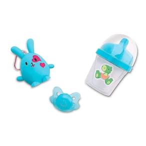 Esse lindo bonequinho tem o rosto com fisionomia de um bebê de verdade. O corpo é muito macio e fofinho! Quando deitado ele fecha os olhos. Ele vem com uma linda touquinha de foguete e com pompons na ponta, vem com chupeta azul e mamadeira mágica com desenho de dinossauro, acompanha também um bichinho que pode servir como um brinquedinho para o boneco ou então um chaveirinho para a criança!