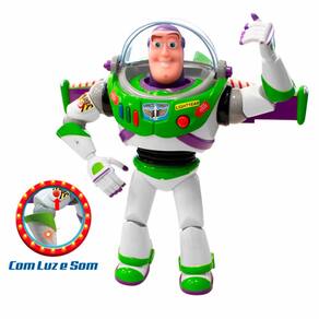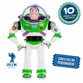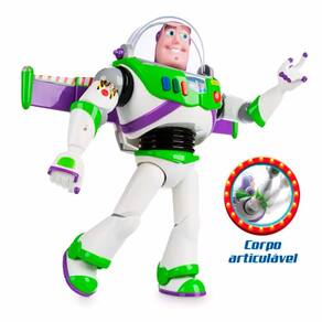 Boneco Interativo - Disney Toy Story - Buzz com Frases - Toyng: Buzz Lightyear nunca fica sem palavras com esse boneco de ação. O Patrulheiro Espacial favorito de todos tem muito a dizer como esse boneco interativo. Apresentando 10 frases clássicas do personagem, além de luzes laser, Buzz tem asas e capacete retráteis acionados por botão! Detalhes: • Boneco articulado do Buzz Lightyear • Com a voz em português do personagem • Mecanismo com 10 frases e sons diferentes do personagem • Algumas frases reproduzidas: “Ao infinito e além”, “Buzz Lightyear ao resgate”, “Temos que salvar a galáxia. Vamos!”, “Estão prontos para uma aventura no espaço desconhecido” e “Eu sou Buzz Lightyear, patrulheiro espacial” • Com botão para ativar o famoso laser com luz e som • Com asas e capacete retráteis acionados por botão Informações: • Produto: Boneco de Ação Buzz Lightyear Capacete com Som • Marca: Toyng • Coleção: Disney • Linha: Toy Story • Tipo: Boneco com sons e frases • Categoria: Bonecos e Cia • Subcategoria: Bonecos de Ação • Tamanho: 30 cm (a) • Conteúdo: 01 Boneco de Ação Buzz Lightyear • Recomendação: para crianças a partir de 04 anos de idade Especificações: • Modelo: Boneco com Luz e Som Buzz Lightyear • Referência: 51050 • Código de Barras: 7899871621994 • Embalagem (C x A x L): 25 x 34 x 14 cm • Embalagem (Peso): 0.944 kg • Material / Composição: Plástico • Alimentação: utiliza 03 pilhas AAA 1.5v (inclusas) • Registro: 007819/2023 • Certificado: Órgãos Autorizados - OCP´S (Organismos de Certificação de Produtos) Aviso: • As imagens são meramente ilustrativas • Os pesos, tamanhos e medidas são aproximados • As cores e estampas dos produtos podem ter variações • As informações são de responsabilidade do fabricante ou fornecedor