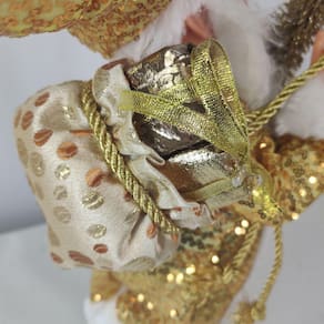 Ele é feito de Polipropileno em sua estrutura, rosto e mãos e para sua vestimenta contamos com Veludo e Poliester e um guizo para completar em seu gorro.