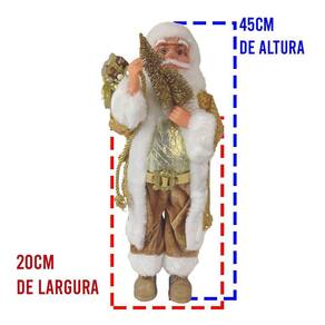 Este é um boneco do papai noel de 45cm de altura, com incriveis detalhes em sua vestimenta, rosto e até os adornos que o mesmo carrega. Ele tem em sua mão uma linda arvore dourado e carrega um saco repleto de presentes e enfeites. Ele é feito de Polipropileno em sua estrutura, rosto e mãos e para sua vestimenta contamos com Veludo e Poliester e um guizo para completar em seu gorro. Faça a mágia do natal acontecer, seja na sua casa, escritorio ou estabelecimento com este lindo Papai Noel! Caracteristicas: Materiais: Veludo, Poliéster e Polipropileno Detalhes incríveis Dourado Resistente Guizo na ponta do gorro Excelente para decorar seu natal. Dimensões Aproximadas: Altura: 45cm Largura: 20cm Comprimento: 20cm Conteúdo da Embalagem: 1x Boneco Papai Noel 3 meses de garantia contra defeito de fabricação **450 MOD: BSL-36041-50C