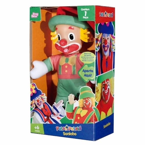 A criança vai poder curtir a hora da preguiça com o melhor amigo os palhaços mais divertidos da história agora pode ser seu. patati e patatá agora na versão soninho. aperte sua barriguinha que ele toca uma linda canção de ninar e acende o rostinho, além do corpinho todo fofinho. informações sobre o produto: utilizase 03 baterias pequenas ag13/l5r44 de 1,5v cada, já inclusa no produto para que o brinquedo execute suas funções é necessário apenas apertar seu peito.assim um som será transmitido. código do fornecedor: 1829 versão do personagem: patatá contém 1 peça embalagem: 22x38x13 cm altura: 36 cm certificado de segurança: cebri/innac 0120201a nm 300/2002 imagens meramente ilustrativas. as cores do produto podem sofrer pequenas variações da imagem exibida. Ean: 7896460318280