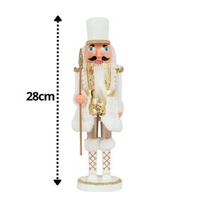 Este Quebra-Nozes decorado em branco e dourado é a peça de luxo que vai elevar sua decoração natalina. Com 28cm de altura, ele é adornado com um bastão com uma estrela dourada brilhante e um chapéu macio em pelúcia, que trazem sofisticação e charme. Além de sua beleza, esse Quebra-Nozes conta com um braço esquerdo articulado e uma boca funcional, acionada por uma alavanca em plástico, tornando-o não apenas decorativo, mas também interativo. Ideal para decorar entradas, mesas ou prateleiras, essa peça é perfeita para quem busca elegância e tradição com um toque de diversão.