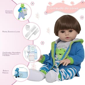 O Boneco Reborn Realista Menino Sapinho é produzido em vinil siliconado atóxico, com olhos castanhos e detalhes realistas. Seus membros articulados e corpo de silicone permitem diversas poses. Acompanha enxoval completo com roupa sapinho, dispositivos de choro, chupeta, mamadeira, certificados, fraldas, luvas, bolsa maternidade, kit de pente e escova, pelúcia e sapatinhos. Possui certificado do INMETRO e é recomendado para crianças maiores de 3 anos. Fala 30 frases. Garantia de 30 dias. Mede aproximadamente 46cm de altura e pesa cerca de 0,745 kg.