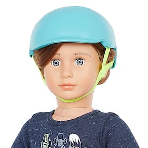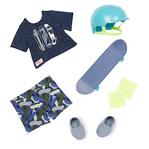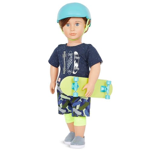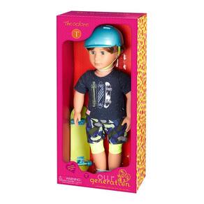 Visite a pista de skate e faça manobras legais com o boneco Theodore de 46cm de Our Generation! Ele tem cabelo castanho curto com olhos azuis e veste camiseta estampada de skate com shorts combinando e um par de tênis de corrida. Ele também tem um par de joelheiras coloridas e um capacete para mantê-lo seguro em todas as aventuras esportivas!
