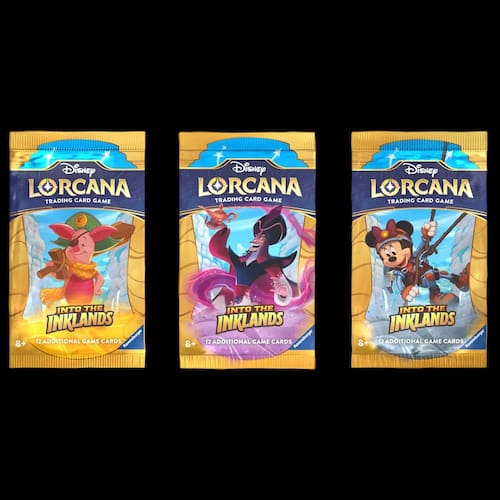 Cada pacote consiste em 12 cartas com uma mistura de cartas comuns, incomuns, raras, super raras e lendárias, incluindo uma carta foil aleatória - cada carta em Disney Lorcana