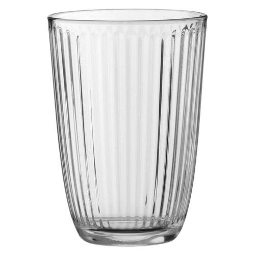 Ele é ideal para servir drinks, sucos de frutas e refrigerantes. O vidro é atravessado por ranhuras densas que desenham um padrão listrado, adicionando um toque cintilante e casual à mesa.