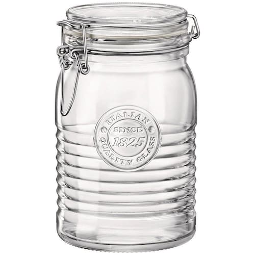 O pote hermético da linha "Officina 1825" pertence à marca Bormioli Rocco, uma renomada fabricante italiana de vidro. Essa marca registrada é o exemplo atemporal do estilo vintage-industrial. O produto possui um fecho hermético e é perfeito para conservar todos os tipos de alimentos secos, por exemplo: leguminosas, massas, arroz, café, sal, açúcar etc. Ele é adequado para o processo de pasteurização, porém inadequado para conter alimentos 100% gordurosos. Esse produto também é um elemento de decoração original para todo tipo de cozinha. Pois possui funcionalidade, formas ergonômicas, inovação, intencionais detalhes indefinidos, um visual arrojado e um apelo retrô, mas ainda assim com ar moderno, criativo e na moda.