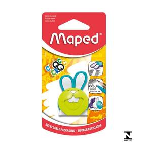 A borracha Croc Croc Coelho é a única borracha que combina uma atividade divertida com a utilidade de uma borracha que apaga diversos tipos de tintas e grafite. Quem não se apaixonaria por este coelinho doce? Com ele, as crianças aprendem enquanto se divertem. Desenhar, apagar e recomeçar é mesmo uma brincadeira de criança. O coelho Croc Croc é composto por uma borracha branca, entre 2 borrachas coloridas, que o protegem do pó. Essas diferentes camadas garantem uma excelente qualidade de apagamento. Embalagem responsável: a borracha Maped é oferecida a você em uma embalagem pet totalmente reciclável, para preservar os recursos de nosso lindo planeta.