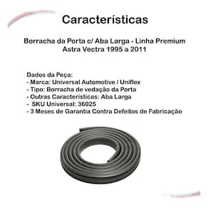 Borracha Porta C/ Aba Astra Vectra 95 A 11 Linha Premium CONTEÚDO DA EMBALAGEM: - Borracha Da Porta - C/Aba Larga - Preta - Alta - Tribulbo - 4 Mts - Linha Premium APLICAÇÃO NOS SEGUINTES VEÍCULOS: Chevrolet: - Astra 1995 a 2011 - Astra Sedan 1995 a 2011 - Omega 1992 a 1998 - Vectra 1993 a 2011