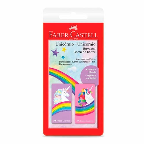 Chegou a nova borracha da Coleção Unicórnio para deixar seu estojo bonito e divertido! Com design exclusivo Faber-Castell, formulação de alta qualidade e livre de PVC. Excelente desempenho ao apagar, produto mais macio e com menos sujeira. Vendido em display com 24 borrachas de design variado ou cartelas contendo 2 unidades cada.