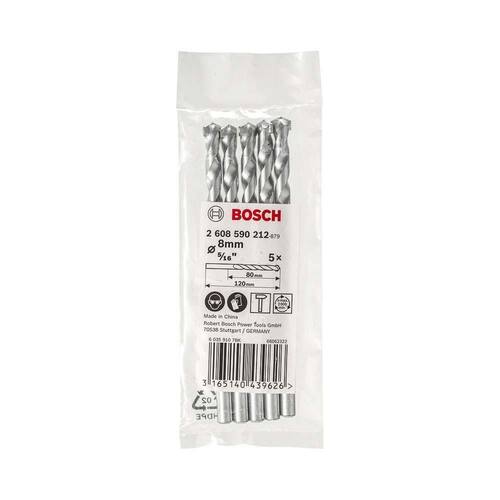 Bosch Broca CYL-1 para concreto 8 x 80 x 120 mm 5 peças Compatível com furadeira de impacto. A broca CYL-1 está otimizada para perfurar alvenaria. A forma de U com 2 espirais oferece boa remoção do pó, enquanto a ponta de metal duro torna a broca mais resistente ao desgaste. Este produto destina-se a utilização em alvenaria.