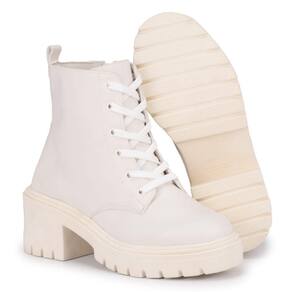 Material: Sintético Palmilha: Macia Fechamento: Zíper Solado Borracha (colado) Altura do salto: 3 cm Altura do cano: 12,5 cm Cores Disponíveis: Off White Bico Arredondado