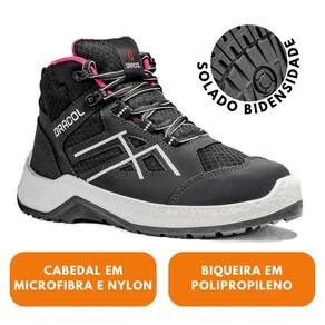 Calçado ocupacional tipo tênis, cano alto, confeccionado em microfibra, com forração em nylon e biqueira de polipropileno. Solado bidensidade em PU, resistência ao escorregamento (SRC) e absorção de impacto (E).