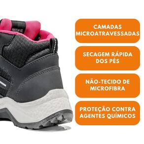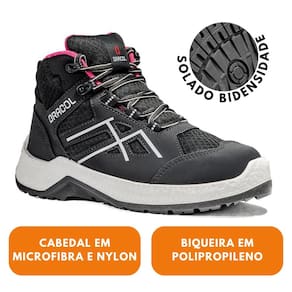 Calçado ocupacional tipo tênis, cano alto, confeccionado em microfibra, com forração em nylon e biqueira de polipropileno. Solado bidensidade em PU, resistência ao escorregamento (SRC) e absorção de impacto (E).
