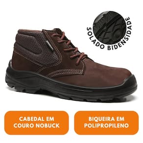 Calçado ocupacional de amarrar, tipo tênis, cano alto, com colarinho acolchoado, confeccionado em microfibra hidrofugada gáspea em fibra de poliéster e cano em napa soft micro perfurada , com forração interna da gáspea em não tecido e forro do cano em tecido com alto poder de absorção bico em polipropileno, palmilha de montagem em não tecido, costurada pelo sistema strobel, palmilha de conforto removível para higienização em PU 8,5 mm na região calcânea e 3,5 mm na região plantar , solado de poliuretano (PU) tridensidade, constituído por três camadas, injetado diretamente no cabedal, com resistência a escorregamento (SRC) e com absorção de impacto na região do calcanhar (E).
