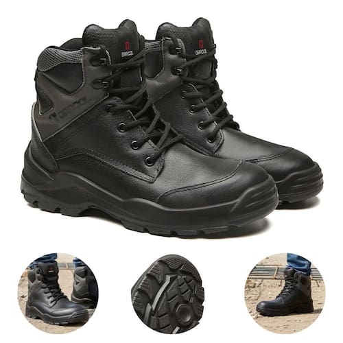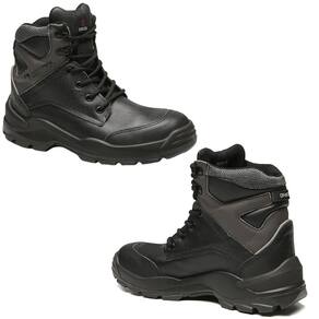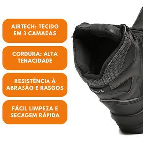 Com biqueira plástica, palmilha de montagem em não tecido costurada pelo sistema strobel e sobrepalmilha de PU 8mm, inserto de barra estabilizadora em Y, com solado em PU bidensidade, injeção direta resistente a escorregamento (SRC), com absorção de impacto na região do salto (E), resistente a óleo combústivel (FO).