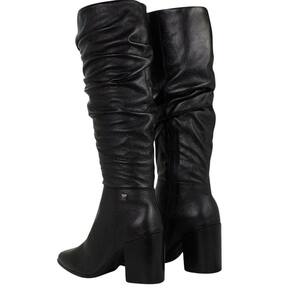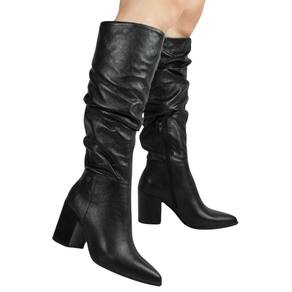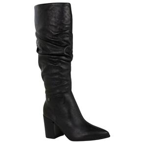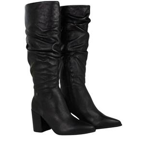 A Bota Bottero Cano Longo é confeccionada em couro roma metalizado preto. De salto bloco alto medindo 9 cm de altura com solado também na cor preto e bico fino. Possui zíper médio na lateral interna, facilitando o calce. Conta com detalhes em rugas ao longo cano, trazendo charme ao modelo. Possui cano alto medindo 38 cm de altura, a circunferência na parte superior do cano é de 41,5 cm. Possui detalhes em metal na cor onix que agregam um charme a mais ao modelo.