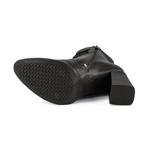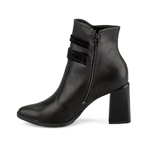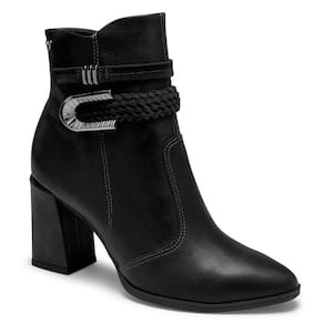 O destaque deste modelo está na tira com aplicação metalizada e tira trançada com fivela metalizada aplicadas no cano, que trazem um detalhe elegante e sofisticado. O salto bloco alto de 8,5 cm proporciona estabilidade e conforto, enquanto o bico fino confere um toque de feminilidade.