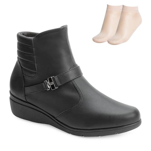 Nome: Bota Cano Curto Piccadilly e Meia PD24-11710. Gênero: Feminino. Indicado Para: Dia a dia. Ocasião: Casual. Material Externo: Alternativo. Material Interno: Têxtil acolchoado. Detalhe: Recortes e costuras no cabedal e fivela com logo da marca na lateral externa. Fechamento: Zíper na lateral interna. Palmilha: Anatômica, forrada e ultra macia. Tipo de Salto: Anabela. Altura do Salto: Médio 5 cm. Cano: 11,5 cm. Circunferência: 28 cm aproximadamente. Solado: Borracha antiderrapante. Peso do Produto: 937 g (o peso varia de acordo com a numeração). Garantia do Fabricante: Contra defeito de fabricação. Origem: Nacional. Código Produto: 02071555. Marca: Piccadilly. Acompanha um par de meias finas tamanho único. Composição: 85% Poliamida e 15% Elastano.