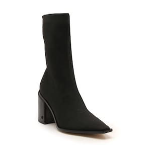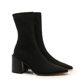 Bota preta salto bloco de 8cm de altura com bico quadrado. A bota feminina knit apresenta cabedal e parte superior confeccionada em malha. Esse estilo de bota combina muito bem com elementos de outono e inverno e com diferentes texturas, desde moletons a jaquetas de couro. Elas adicionam um toque de estilo descontraído e acolhedor a qualquer roupa.