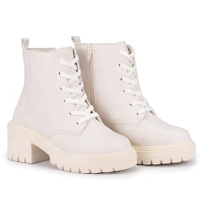 Material: Sintético Palmilha: Macia Fechamento: Zíper Solado Borracha (colado) Altura do salto: 3 cm Altura do cano: 12,5 cm Cores Disponíveis: Off White Bico Arredondado