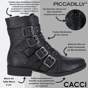 Clássica e versátil. A Bota Piccadilly feita de material Napa Amassada trás uma proposta bem diferenciada e moderna, apresenta todo seu cabedal com muitas peças metalizadas que trazem toda a atenção para o seus pés! Além de proporcionar leveza e flexibilidade aos seus pés. O calçado possui solado superaderente e palmilha super-estabilidade garantindo mais segurança ao caminhar. Já o acabamento confortável e o forro superfofinho torna-a indispensável para quem precisa ficar horas de pé no trabalho. Aposte na combinação do modelo com peças de inspiração boho para um look fashion e romântico. Experimente usar com vestidos florais, chapéus de feltro e acessórios em camurça. PICCADILLY, caminhe em direção ao novo e se surpreenda com o conforto! Você sabia que todos os produtos da PICCADILLY têm o Calce Perfeito? É um conjunto de benefícios exclusivos que respeita a anatomia do pé, diminui o cansaço e permite que você vá mais longe nas suas jornadas diárias.