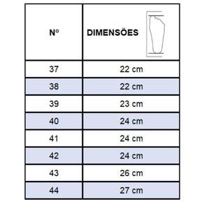 Recomendações de Uso: A limpeza do calçado pode ser feita com Detergente neutro e pano úmido. Não deixar submerso em água e não utilizar nenhuma forma de calor para secar. Guardar em local sem umidade.