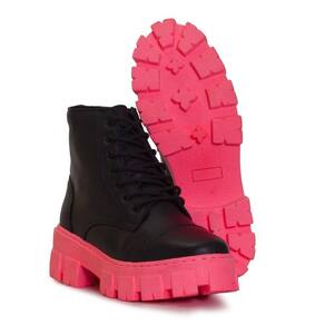 Bota Coturno Feminina Tratorada Couro Sola Colorida Cano Medio Cadarço Bico Redondo - 35 - Preto