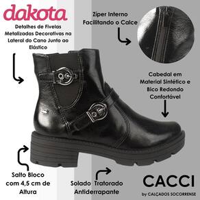 O destaque do modelo são as tiras com regulagem metalizadas decorativas no cano e a peça em elástico aplicada no cano, que agregam estilo. Além de ser fácil de calçar, conta com fechamento pratico na lateral do cano. Versátil e prática, a bota Dakota combina com diversos looks, desde vestidos e saias até jeans e camiseta.