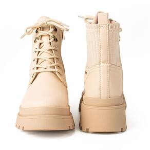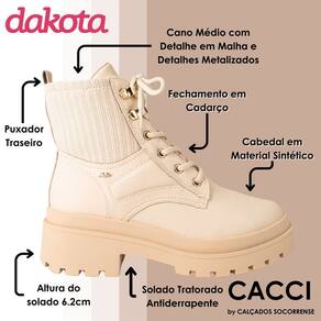 Confeccionada em material sintético macio e resistente, a bota coturno garante conforto e durabilidade. A sola tratorada proporciona estabilidade e segurança para você pisar com estilo em qualquer lugar, assim como o salto bloco. O cano médio em tecido garante conforto e estilo. Os detalhes metalizados, como ganchos e passadores, complementam o visual com um toque moderno e sofisticado.