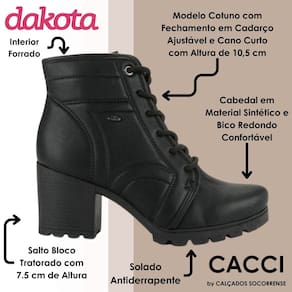 A Bota Coturno Dakota de Salto Bloco é a escolha perfeita para quem busca um calçado estiloso para o dia a dia. Com design atemporal e monocromático, a bota apresenta costuras nas laterais que criam um visual elegante e moderno. O salto bloco de 7.50 cm garante estabilidade e conforto, enquanto o cadarço de amarrar permite um ajuste perfeito aos pés.