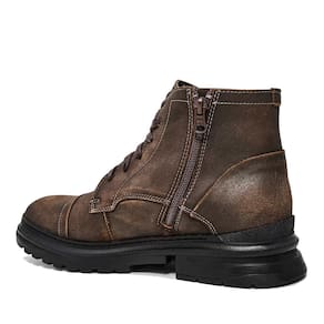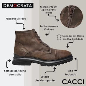 A bota Garage Eron é confeccionado em couro na cor marrom. O fechamento é em cadarço de amarrar, bico arredondado, forro de tecido e a palmilha é feita de Fibra. Seu solado é feito de Borracha.