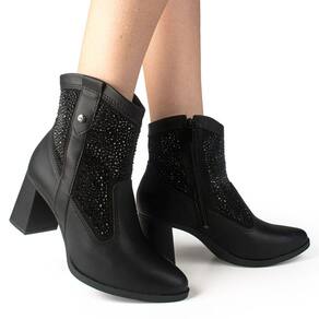 Confeccionada em material sintético macio e resistente, a bota garante conforto e durabilidade. O salto bloco alto de 7,3 cm proporciona estabilidade e segurança para você caminhar com confiança. O zíper na lateral do cano facilita o calce e garante um ajuste perfeito aos pés. O destaque dessa bota fica por conta dos brilhos aplicados em toda a superfície, que garantem um visual moderno e cheio de estilo.