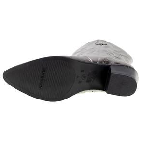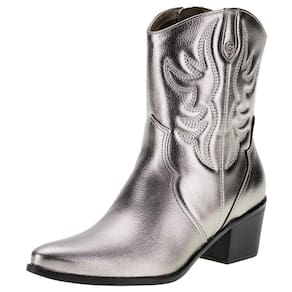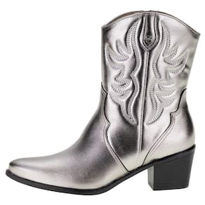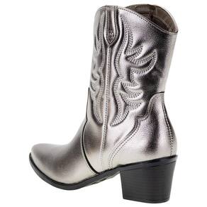 A Bota Feminina Country Cano Baixo Via Marte é feita em material metalizado com acabamento em costura, fechamento por zíper, forro em têxtil, palmilha em PU e solado em borracha com salto grosso de cinco centímetros e meio. O cano mede de vinte centímetros de altura por trinta e dois centímetros de circunferência.
