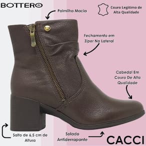 O cabedal em couro garante um visual elegante, com acabamento de alta qualidade que traz resistência e beleza ao modelo. Seu fechamento em zíper lateral facilita o calce e torna o uso ainda mais prático, ideal para uma rotina dinâmica. Internamente, o conforto é prioridade: a palmilha macia proporciona uma sensação aconchegante desde o primeiro passo, permitindo que seus pés fiquem bem-cuidados ao longo de todo o dia.