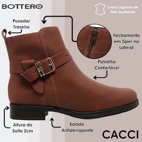 Com cano curto e fechamento através de fecho-éclair na lateral, esta bota também possui uma peça de fechamento prático de metal onix na parte externa do pé, adicionando um toque de sofisticação ao modelo. Seu solado emborrachado oferece segurança e conforto em cada passo.