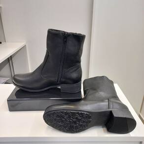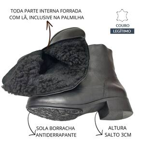 Bota Feminina Preta em couro toda forrada com lã preta inclusive na palmilha salto baixo, solado emborrachado, forrada em pele sintética. O salto quadrado é da linha conforto antiderrapante, cano médio. Perfeita para dias frios, toda parte interna é forrada em lã até os dedos e palmilha. Medidas Aproximadas do Produto: Altura do salto: 3 cm; Circunferência do Cano: 24 cm; Altura do Cano: 18 cm (medida do salto até o final do cano) Material: Couro Forro Interno: Forrado com lã sintética macia. Tamanho da Forma: Normal. Recomendamos comprar o mesmo número que costuma usar, a bota se adapta rapidamente ao formato do pé. Fabricação Nacional. Marca: QR Shoes MEDIDAS DA PALMILHA TAMANHO 35 23,4CM 36 24,2CM 37 25CM 38 25,6CM 39 26,2CM 40 27CM Marca: QR Shoes Marca: QR Shoes Marca: QR Shoes