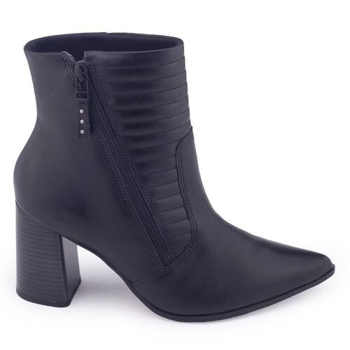 A Bota 24-68103 é um modelo clássico tem cabedal fabricado em material sintético liso com detalhe em costuras. É um modelo confortável, apresenta um bico fino e fechamento por zíper na lateral interna. Toda forrada internamente, sua palmilha é fixa, macia e revestida em material têxtil apresentando a logo da marca. O salto bloco com cantos arredondados, possui aproximadamente 12,5cm de altura com acabamento fachetado, é confortável e traz segurança ao caminhar. Seu solado possui frisos para maior segurança.